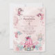 Diese skurrile und bezaubernde Geburtstagsfeier lädt mit einem Märchenmärchen im Märchengarten zur Prinzessin ein. Der Hintergrund weist ein sanftes, in Marmor gehaltenes rosa und weiße Muster auf, das verschiedene Bilder um den Rand herum enthält. Zwei niedliche Feen sind in den oberen Ecken gedruckt, mit Diamant-Glitzer-Staub bestreut. Zwei Schmetterlinge sind unter den Feen auf beiden Seiten aufgedruckt. Ein Schmetterling ist eine hübsche Rose rosa und der andere ein rieszierendes Blau. Zwei weitere Feen sind unten bedruckt und fliegen über einem niedlichen kleinen Gartenhaus. Die Fee rechts trägt eine funkelnd Prinzessin-Krone. Hübsche pastellfarbene Blumensträuße heben die unteren Ecken hervor.