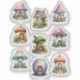 A charming collection of fantasy homes designed to bring a touch of magic to planners, journals, scrapbooks, and craft projects. Each sticker features a unique architectural style—some perched atop twisting roots, others nestled beneath oversized mushroom caps, and still others glowing from within with warm cottage windows.