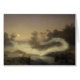 Ein Kunstbild von mehreren Feen in weißem Nebel, der über Wasser fliegt. Landschaft mit nächtlichem Himmel und Wald als Hintergrund. Malerei durch August Malmstom