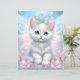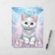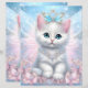 Ein zauberhaftes, weißes Kätzchen mit Schmuck, rosa Blume und Märchenflügel auf funkelnd, blauen Hintergrund.