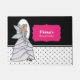 Entworfen auf meine Mode-Illustration einer wunderschönen blonden Haaresängerin, die ein atemberaubendes, klassisch elegantes weißes Blume Blütenblatt trägt. Das Design hat schwarz-weiße Polka Dots im Hintergrund - eine schicke und moderne Türmatte, perfekt für Ihre Zuhause oder Ihr Geschäft. Anpassbar mit eigenem Text für ein personalisiertes Design.