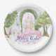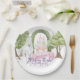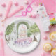 Dieses zauberhafte und bezaubernde Party-Teller mit einem Märchenmotiv im Aquarellstil. Ein Bild eines Schlosses wird in der Ferne, jenseits der Gärten, abgebildet. Ein majestätisches weißes Pferd läuft vor dem Bild, unter hübschen pastellfarbenen Wildblumen.