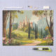 Eine malerische Abbildung einer großen Burg auf einem Hügel, umgeben von blühenden Frühlingsblumen und üppigen Bäumen. Diese idyllische Szene besticht durch eine zauberhafte Märchenlandschaft mit hohen Türmen, landschaftlichen Wegen und einer ruhigen Waldkulisse.