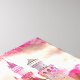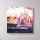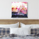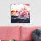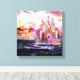 Ein atemberaubender Sonnenaufgang bricht in goldener, rosa und lila Pracht über eine märchenhafte Burg am Ozean.