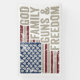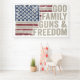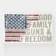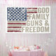A distressed American flag anchors this bold declaration of values: God, Family, Guns & Freedom. With vintage texture and commanding typography, the design speaks to enduring convictions and the spirit of liberty.