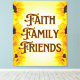 Diese Wandkunst zeigt die Worte "Faith Family Friends" in einem einzigartigen Schriftart aus dem Brookeshire der EFCO mit braunen Buchstaben, goldener Kontur und Sonnenblumen auf den Seiten des Textes mit einem gelben und weißen Hintergrund in diesem religiösen Thema. Unsere Drucke werden mit der höchsten Auflösung auf dem Baumwolle-Poly-Archivpapier gedruckt, für eine langlebige verblasste Druckgröße von 40,00" x 48,60". Dieser Druck sorgt für die perfekte Ergänzung, um jede Zuhause oder jedes Büro aufzuräumen.