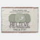 Der kleine Junge wird in einer entspannten Pose hoch in den Baumkronen gesehen, die das obige Zitat illustrieren, das uns daran erinnert, zu halten, zu atmen, zu beten und lassen, den Glauben zu beruhigen. Die Formen der Stämme dieser Bäume prägen das Wort "BELIEVE" und das Zitat "im Unglaublichen, das du bist!" unten, das das bekannte Sprichwort von David A. Carrizales ergänzt. Zeichn ist von Christie Black.