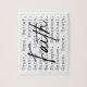Set against a white background, this jigsaw puzzle features the word “faith” in flowing script that stretches confidently across the center. Behind it, filling the space beneath the main word, are lowercase typewriter-style words—each one a reflection of faith’s many facets. Words like trust, hope, peace, truth, and belief stand out in uniform rows, creating a textured backdrop of conviction and clarity. The layered typography creates both contrast and cohesion. It's a visual meditation on what faith is made of—simple, striking, and quietly powerful.