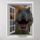Poster mit T-rex Dinosaurier, Fake Fensterszene, für ein fensterloses Zimmer oder Bürowand. Spaß, realistische optische Täuschung landschaftliches Poster für ein Büro oder eine Studiowand.