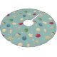 Falda para tapar la base del árbol de navidad, puedes escoger entre varios diseños, en este tienes decoración navideña sobre fondo azul. Campanas, estrellas y bolas de navidad en tonos verde, dorado, rojo y azul.