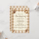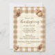 Acorne und Kiefernzapfen auf braunem Gingham geben diesen rustikalen Erntedank lädt ein suble und einfache Waldlandschaft Charme. Das Wort "Erntedank" zeichnet sich durch eine schöne Schriftzeichen aus, während die Vorlagen für alle wichtigen Informationen leicht zu lesen sind. Ein Kiefernkegel und Eicheln auf der Rückseite bringen eine weitere besondere Touch.