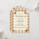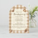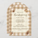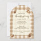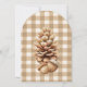 Acorne und Kiefernzapfen auf braunem Gingham geben diesen rustikalen Erntedank lädt ein suble und schlichte Waldlandschaft auf einer stilvollen Bogenform. Das Wort "Erntedank" zeichnet sich durch eine wunderschöne Schrift-Typografie aus, während die Vorlagen für alle wichtigen Informationen leicht zu lesen sind. Ein Kiefernkegel und Eicheln auf der Rückseite bringen eine weitere besondere Touch.