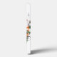 Das schmale, weiße iPhone-Gehäuse mit einer farbenfrohen Collage mit Gesichtern, Blume und Früchten.