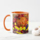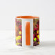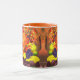 Eine Tasse mit meinem Kürbis-Design inmitten von Herbstgarten-Favoriten wie Squash, Äpfel, Trauben, Äpfel und Orangen, mit Herbstblättern und Kiefernzapfen.