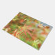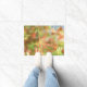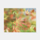 Vor dem Hintergrund der grünen Sommer-Blätter eines japanischen Ahorns, der bis Herbstrot und Gelb spült, tropft ein Rose- und Goldskelettblatt langsam in den Boden.