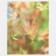 Vor dem Hintergrund der grünen Sommer-Blätter eines japanischen Ahorns, der bis Herbstrot und Gelb spült, tropft ein Rose- und Goldskelettblatt langsam in den Boden.