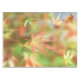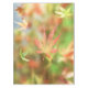 Vor dem Hintergrund der grünen Sommer-Blätter eines japanischen Ahorns, der bis Herbstrot und Gelb spült, tropft ein Rose- und Goldskelettblatt langsam in den Boden.