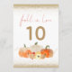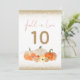 Fall in Liebe Pumpkins Gold Glitzer Hochzeit Tischnummer. Herbstvibes mit orangefarbenen und cremefarbenen Pumpkins und Blumen mit einer Touch von Imitaten Glitzer und goldenen Imitaten Glitzer Rand oben und unten für ein wenig funkeln. Die Tischnummer ist in Gold. Der Fall in der Liebe steht in einem eleganten Set-Skript ganz oben. Das gleiche Design ist auf der anderen Seite.