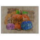 Fall leopard print pumpkins in blue, purple, orange and rose pink set on textured Autumn brown plaid background.