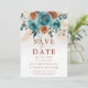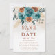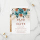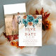 Dieses HerbstAquamarine Burnt Orange Botanische Blumenhochzeit-Foto erfasst Save the Date die Essenz des Herbstes mit einer bohobaroten botanischen Blumengrenze mit Aquarellfarben-Rose und Hochzeitsfolien in den reichen, warmen Tönen aquamariner und verbrannter Orange. Das einladende Design wird durch eine helle Aquarellstruktur ergänzt, die die frische Luft und die goldenen Farbtöne des Herbstes hervorruft. Ideal für Paare, die eine rustikale Gartenhochzeit oder eine gemütliche Hinterhofsstimmung planen, spiegelt diese Einladungssuite perfekt die gemütliche und romantische Atmosphäre der Herbstsaison wider und verbindet romantische Kunstwerke mit eleganter Einfachheit für jeden Ort.