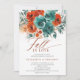 Der Herbstfall in der Liebe Aquamarin Burnt Orange Botanische Blumenhochzeit oder Brautdusche Die Einladung fängt das Wesen des Herbstes mit einer bohonen botanischen Blütengrenze mit Aquarellfarben und Hochzeitsblättern in den reichen, warmen Farbtönen aquamariner und terracotta verbrannter Orange und dem Titel "Fall in Liebe" in moderner Kalligrafie ein. Das einladende Design wird durch eine helle Aquarellstruktur ergänzt, die die frische Luft und die goldenen Farbtöne des Herbstes hervorruft. Ideal für eine Braut, die ein rustikales Brautparty, ein Gartenfest oder ein gemütliches Hinterhoffest planen, spiegelt diese Einladung perfekt das gemütliche und romantische Ambiente der Herbstsaison wider und verbindet romantische Kunstkunst mit eleganter Einfachheit für jeden Ort.