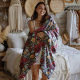 Ein dramatisches, tiefburgundes, blumengeschmücktes Muster vor dunkelgrauem Hintergrund.