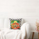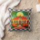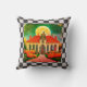 Herbst Moon Throw Kissen - warmes Mondglühen strahlt auf einem Kürbisgarten im Schloss. Die Farben sind grün, orange, creme, schwarz und weiß kariert.