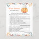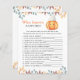 "Ein kleiner Kürbis ist unterwegs. Feiern Sie mit diesem Baby Cartoon Kürbis Thema für Baby Dusche Party! Wasserfarbener niedlicher Cartoon Kawaii Kürbis mit Herbstmütze (Kappe) und Herbstlauben. Auf der Rückseite der Karte befinden sich Herbstblätter.