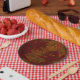 Im Herbst rustikale rote goldene Neon dunkle elegante Ahornfische Blätter fallen thematisch Hochzeit. Fallen Sie Teller auf Papier. Bildrecht Marg Seregelyi Fotografie.