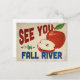 Eine bezaubernde Herbst River Massachusetts Vintage Reise-Postkarte mit einem schönen roten Apfel, zusammen mit lustigen Retro-Text, der sagt: "See you in Fall River"
