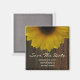 Eine Hochzeit im Herbst speichert den Datums-Magneten mit einem Bild einer gelben Sonnenblume, die von oben auf einem Hintergrund aus Barnwood herumschaut wird. Personalisieren Sie den Text. Achten Sie auf passende Einladungen, rsvp-Karten und mehr im Pink Schoolhouse.