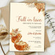 The image shows a fall-themed invitation card with the text "Fall in love" decorated with pumpkins and autumn leaves. The card exudes a warm, cozy feel.