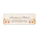 Herbst- und Herbstthematische Hochzeitsmarken mit Weinrebe, Eichenholz-Blätter, Peony-Rose und Blumendesign auf antikem Pergament-Hintergrund. Die Farbtöne Orange, Korallen, Grün, Braun und Gelb. Ideal für eine Country-Chic, Erntedank, rustikale, Scheune oder Bauernhof themed Hochzeit oder jeden Anlass. Artwork © Chrissy H. Studios, LLC. Alle Rechte vorbehalten.