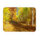 An einem sonnigen Herbsttag schlängelt sich ein überwachter Weg durch den Birkenwald. Die schwarz-weißen Baumstämme kontrastieren mit Blätter und Gras in allen Goldtönen, von hellgelb bis orange, die von den Sonnenstrahlen, die durch die Äste strömen, erhellt werden.