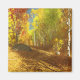 An einem sonnigen Herbsttag schlängelt sich ein überwachter Weg durch den Birkenwald. Die schwarz-weißen Baumstämme kontrastieren mit Blätter und Gras in allen Goldtönen, von hellgelb bis orange, die von den Sonnenstrahlen, die durch die Äste strömen, erhellt werden.