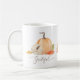 "Fall Pumpkins Dankbarkeit Wasserfarbe Herbst Blätter mit Script Coffee Tasse." Moderne, hübsche Aquarellbilder mit einem orangen und weißen Kürbis, gefallenem Blattgrün mit der einfachen Schreibweise "Dankbar" in Typografie. Alle Kunstwerke von Audrey Jeanne Roberts, international lizenzierter Künstlerin und Designer, urheberrechtlich geschützt.