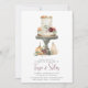 Diese reizvolle Einladung für die Herbst- oder Herbstfest-Verlobungstreffen zeigt eine Aquarellillustrierung eines kunstvoll gestuften Kuchens, der mit Kürbissen, Grünpflanzen und bordeauxfarbenen Blume geschmückt ist. Die Details des Party sind in Weich- und Bordeauxtönen gehalten.