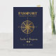 Feiern Sie Ihre Liebe mit dieser eleganten Hochzeitseinladung im Reisepass-Design für Ihre Destination-Hochzeit, die einen stilvollen navyblauen Hintergrund mit einem faux-goldenen Kompass-Design aufweist. Perfekt für eine reiseorientierte Hochzeit, verleiht diese einzigartige Einladung Ihrem besonderen Tag einen Hauch von Abenteuer und Raffinesse.