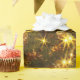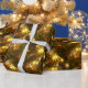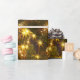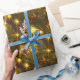 "Frohe Weihnachten und ein glückliches Neues Jahr" - glamouröses Urlaubspapier mit goldenen Weihnachtsbaummöbeln, glitzernden Lichtern, Kiefernzapfen und Weihnachtsbaumästen.