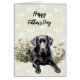 Der glückliche Vatertag vom Hund. Schwarzes Labor in Wildblumen Design mit Hinterherzen Muster. Erstellen Sie eine personalisierte Nachricht im Inneren. Verwenden Sie einen ähnlichen Beispieltext, der für Papa vom Hund ist, oder ändern Sie ihn von den Kindern oder der Familie.