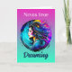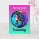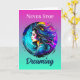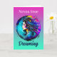 Hübsche Frau mit blauer, türkisfarbener, blauer, gelber und roter Luftkunst in einem mystischen, ätherischen surrealen Ambiente. Inspirationssatz: "Hör niemals auf zu träumen."