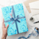 Elegantes Verpackungspapier mit türkisfarbener Blume und wirlem Design auf hellblauem Hintergrund. Dieses hübsche Verpackungspapier wäre ideal für Hochzeitsgeschenke, Muttertagsgeschenke, Altersgeschenke und vieles mehr.