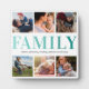 Editierbare Foto-Plakette mit einem schicken, weißen Hintergrund, der in jede Farbe geändert werden kann, 6 quadratische Bilder, das Wort "FAMILY" in einem stilvollen aquamarinen Farbverlauf Schriftart, plus Ihre, Ihre Partner und Kindernamen.