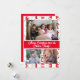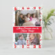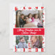 Das Design bietet Platz für drei Fotos vorne, mit gemustertem Hintergrund von Santa Caps, Weihnachts-Strumpf und Bonbons. Auf der Vorderseite wird der Text in weißer Kursiv auf einer roten, rechteckigen Seite angezeigt. Auf der Rückseite befindet sich ein komplett roter Hintergrund, der in einem weißen, kursiven Schriftart angezeigt wird.