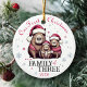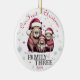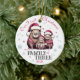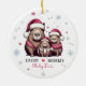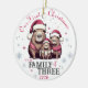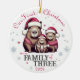 Personalisieren Sie diese niedliche Familie von drei Capybara in Weihnachtsmannmützen & Schneeflocken "Unser erstes Weihnachten als Familie der Drei" runden Keramik mit dem Jahr, das auf der Vorderseite gedruckt wird, und "Papa, Mommy, Personalisiert Babyname" auf der Rückseite - das perfekte Geschenk für neue Eltern, um Jahr für Jahr bei der Beschneiung des Weihnachtsbaums zu pflegen! Happy Holidays aus Fig und Lily Studios in Form