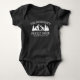 Baby Ganzkörperanzug mit personalisiertem Familiennamen und Kabine, Hütte oder anderen gewünschten Texten. Zu den Vorzügen des Hauses gehört eine individuell gestaltete weiße Silhouette von rustikalen Bäumen und Bergen.