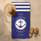 Familienname Nautical Ship Anchor Stripes Beach Handtuch. Marineblau-weißes Badetuch mit personalisiertem Familiennamen rund um einen marinen Themenanker in der Mitte. Genießen Sie Ihren Sommerurlaub am Strand, am See, am Swimmingpool oder im Garten.