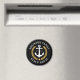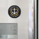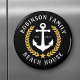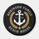 Ein stilvoller nautischer Themenmagnet, ein runder Kühlschrank-Magnet mit Ihrem personalisierten Familiennamen und Strandhaus, Seehaus oder anderen Wunschtexten und festem Datum. Ein speziell entworfener Bootanker mit goldfarbenen Lorbeertönen-Blätter und ein Stern auf schwarz oder passen die Basisfarbe einfach an Ihre aktuelle Dekoration oder Ihr aktuelles Thema an.