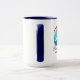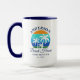 Familienname Beach House Sommerpalmen Sonnenuntergang Retro Stil Große Tasse Kaffee. Personalisieren Sie mit Ihrem Familiennamen, Standort, Jahr oder Datum festgelegt und mehr. Navy Blue Text oder wählen Sie Ihre Farbe. Zwei Tone Blau und Weiß.