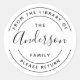 Einfaches, sauberes, modernes Design für Ihre persönlichen Bücher aus der Bibliothek. Dieses kreisförmige Buchzeichen ist leicht mit Ihrem Familiennamen zu personalisieren. Gutes Geschenk für jeden Buchliebhaber. Die Typografie besteht aus einer modernen serifenlosen Schrift in anmutigen Bögen. Ihr Familienname erscheint in einem eleganten Skript-Schriftart im Mittelpunkt.